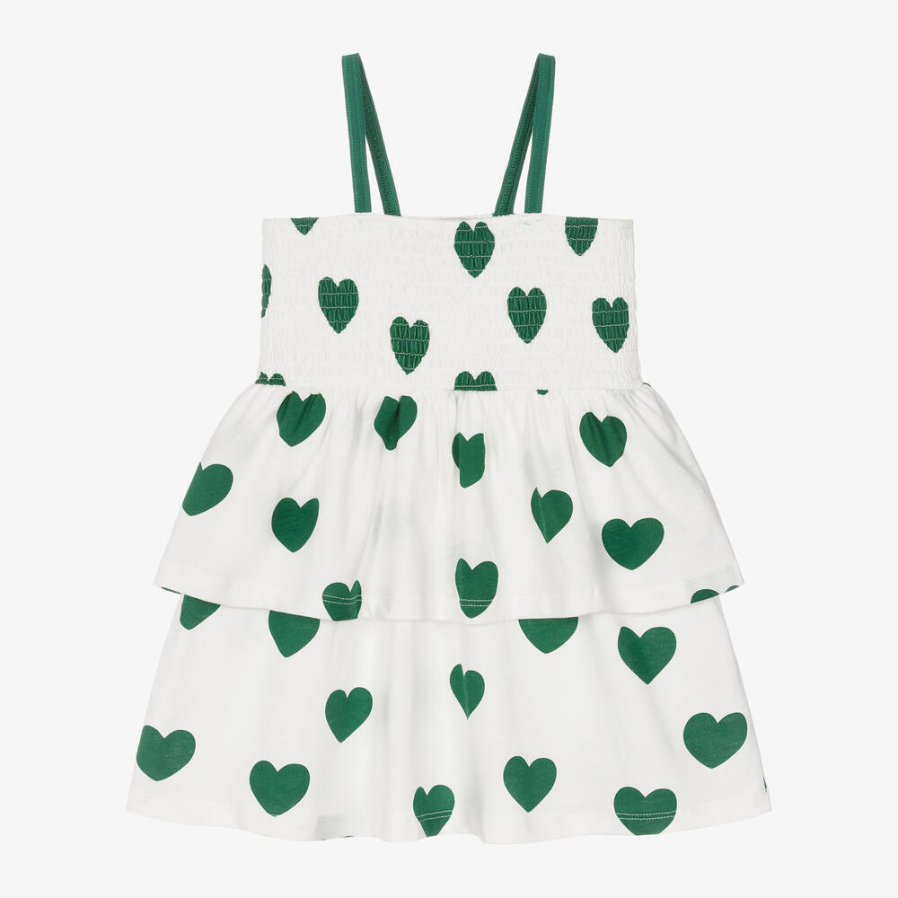 White organic cotton sundress for girls by Mini Rodini, with a dark green heart pattern. Made in soft jersey, this sweet and simple style has a comfortable, shirred bodice with green shoulder straps and a ruffled, tiered skirt for a pretty silhouette.