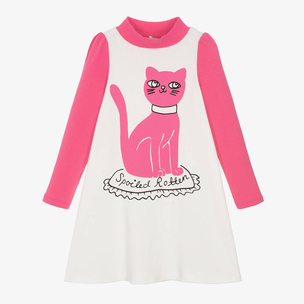 An off-white and pink dress for girls by Mini Rodini, made in soft organic cotton jersey with a flared silhouette. The gently ribbed fabric is printed with a pampered pink cat and a 'Spoiled Rotten' slogan. The long sleeves gently gather on the shoulder and the high, ribbed collar covers more of the neck. The swedish designer's name can be seen on the back for brand recognition.