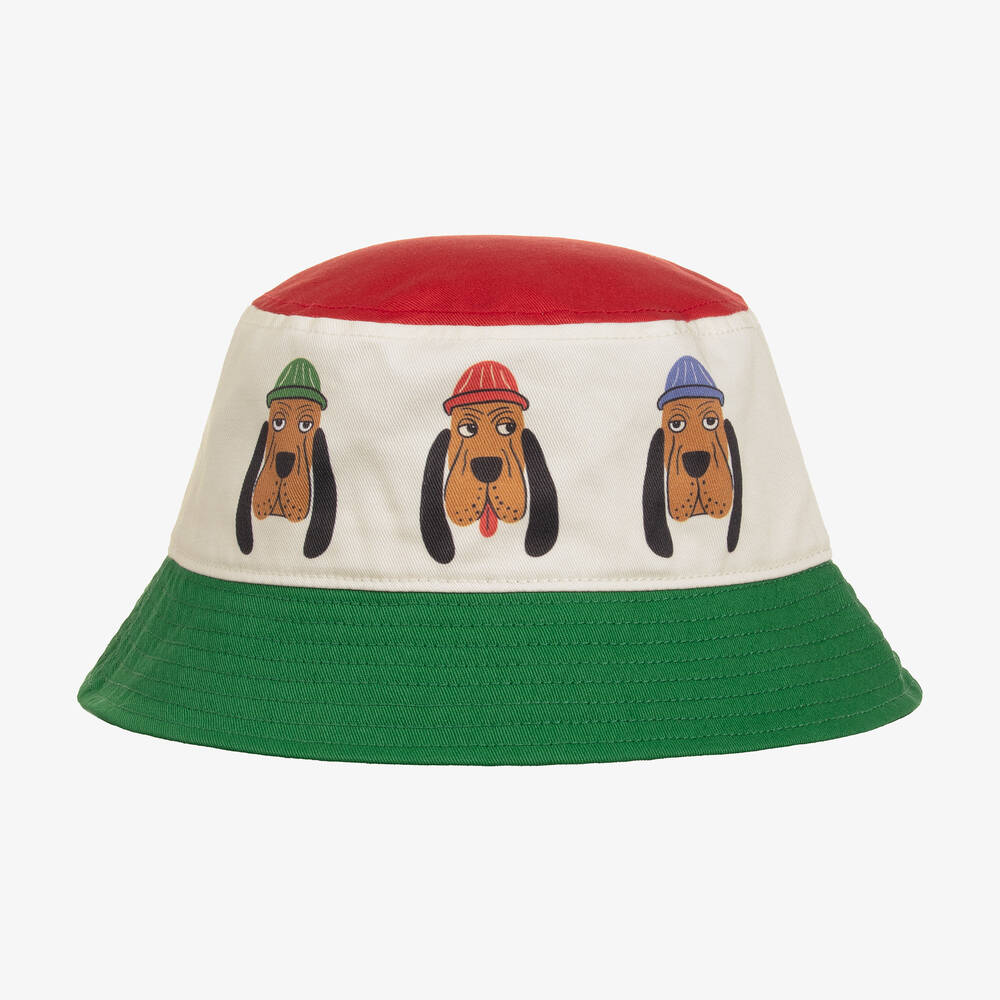 A playful red, ivory and green bucket hat for boys and girls from Mini Rodini. Made in soft organic cotton twill, this sun hat has three adorable brown hound dog motifs on the front. Classically styled, the brim has rows of tonal stitchings.
