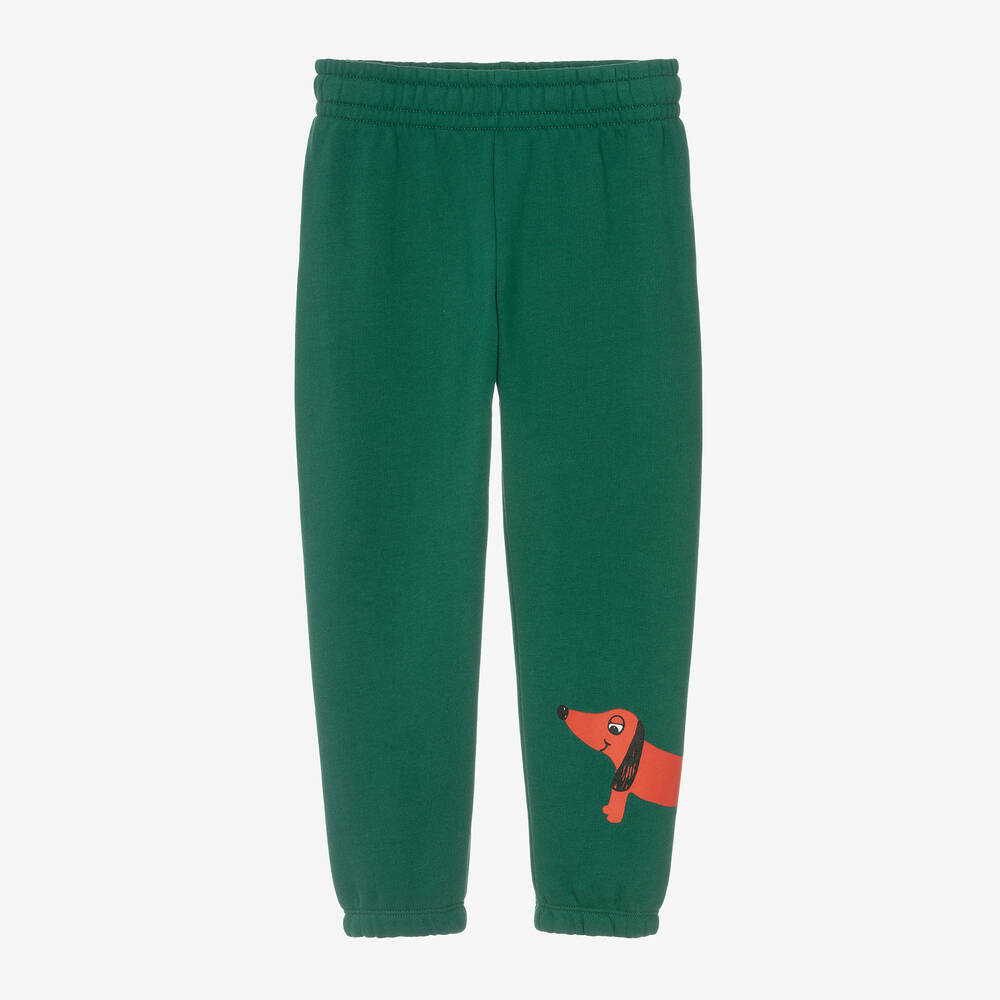 Green joggers for boys and girls by Mini Rodini, made in soft, mid-weight organic cotton jersey. Cosy with a fleecy underside, they are gently elasticated around the waist with an internal drawstring for a comfortable fit. There is a cute red sausage dog motif on one leg, adding fun and a splash of colour to this casual piece.