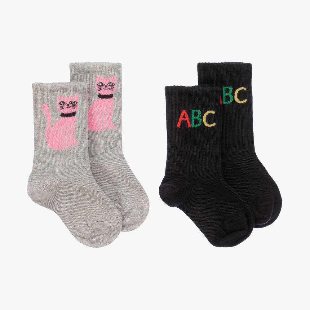 Pack of two grey and black socks for boys and girls by Mini Rodini, made in a soft and stretchy organic cotton blend. The black pair have an ABC motif in orange, green and yellow, whilst the grey pair have a cute pink cat design. Both feature the brand's logo for a subtle designer touch.
