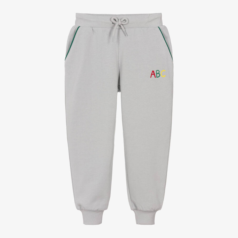 Cloud grey joggers for boys and girls by Mini Rodini, made in mid-weight organic cotton jersey. Easy to move around in, these casual joggers have snug ribbing on the cuffs and a functional drawstring on the waistband. There are slim green trims on the pockets and colourful 'ABC' letters embroidered on one leg.