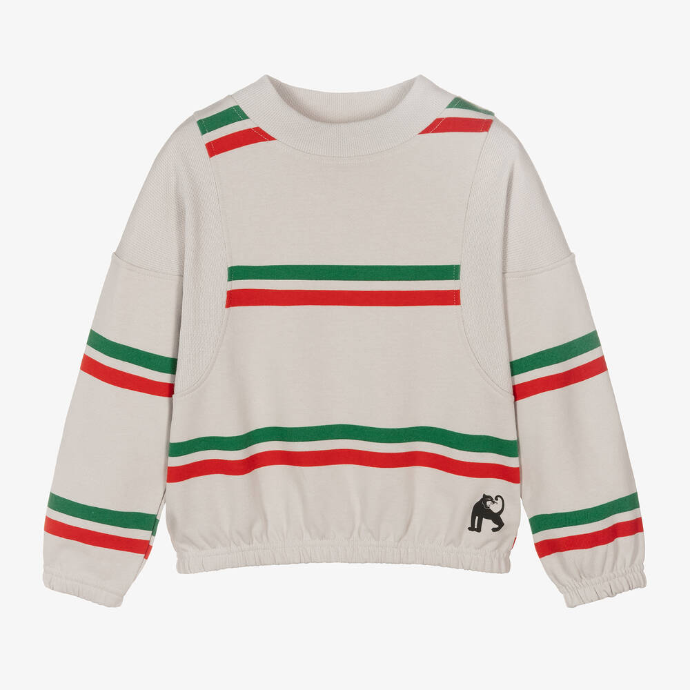 A casual pale grey sweatshirt for boys and girls by Mini Rodini, made from soft organic cotton jersey. It is patterned in green and red stripes with a black panther mascot printed on the front for a vibrant, sporty look. It has dropped long sleeves with mesh trims and an elasticated hem.