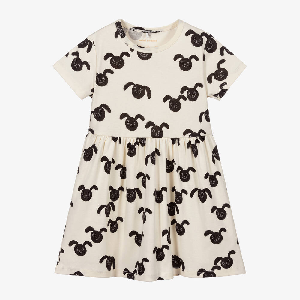 Girls ivory dress by Mini Rodini, made in soft organic cotton jersey. It has a black rabbit print and slips on easily over the head.