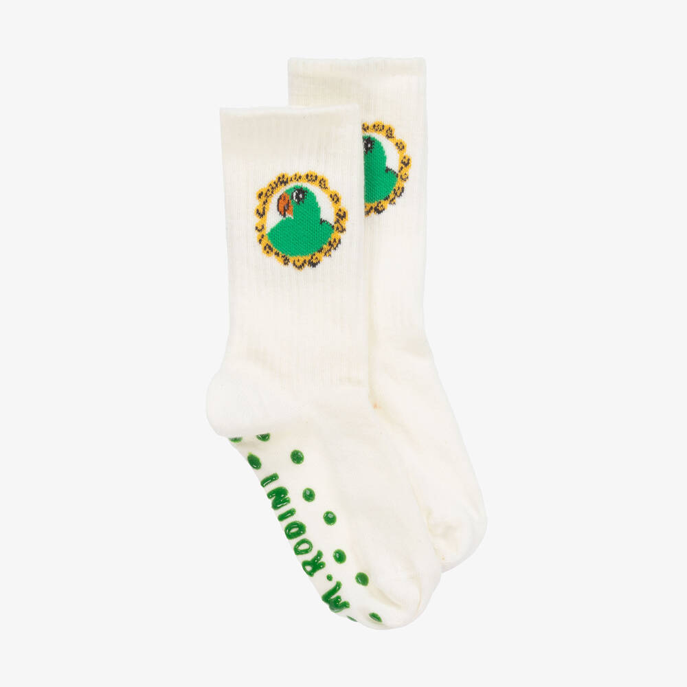 Ivory socks for boys and girls by Swedish brand Mini Rodini, with fun parrot motifs. Soft and stretchy, they are made in an organic cotton bend, with anti-slip pads and the designer's name in green underfoot.