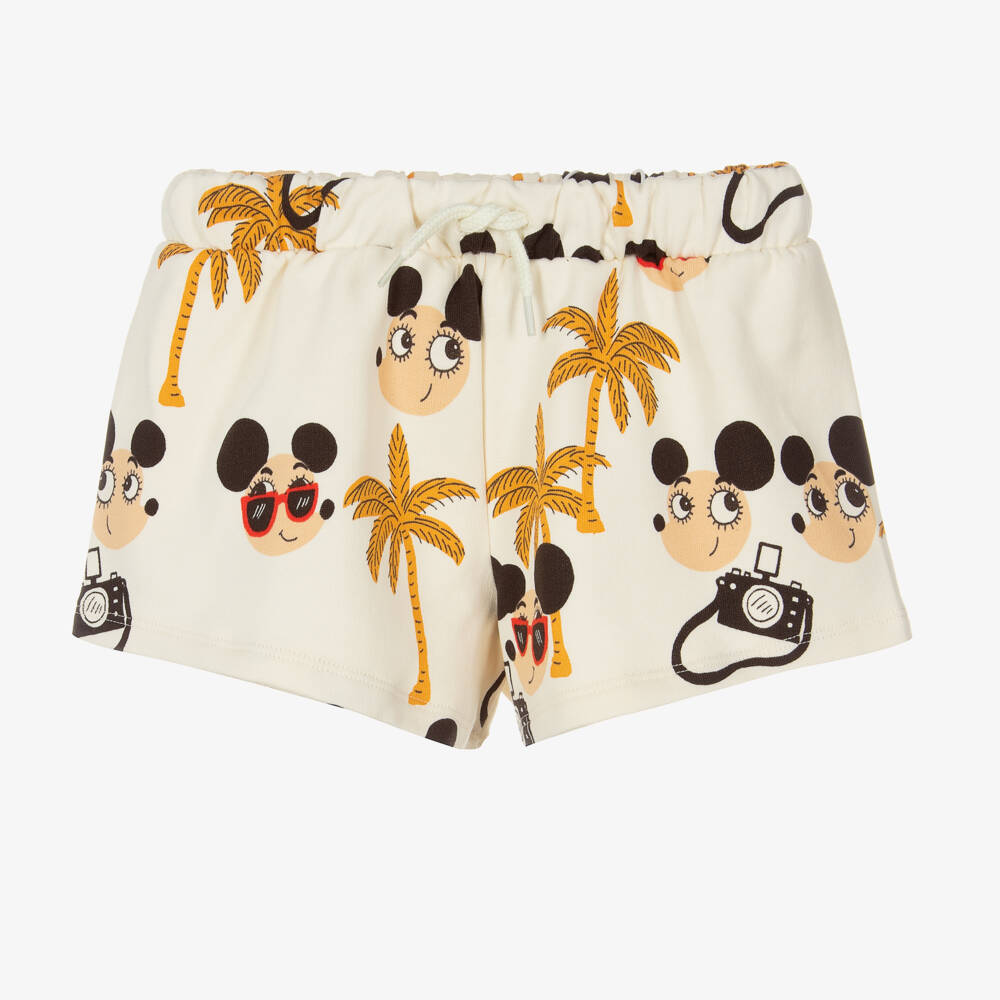 Ivory shorts for boys and girls by Swedish brand Mini Rodini, made from soft organic cotton jersey. These casual shorts have a fun pattern, featuring the brand's Ritzratz characters, cameras and palm trees in beige and black. A comfortable, easy-to-wear style, they have an elasticated waist with drawstring ties for a good fit.