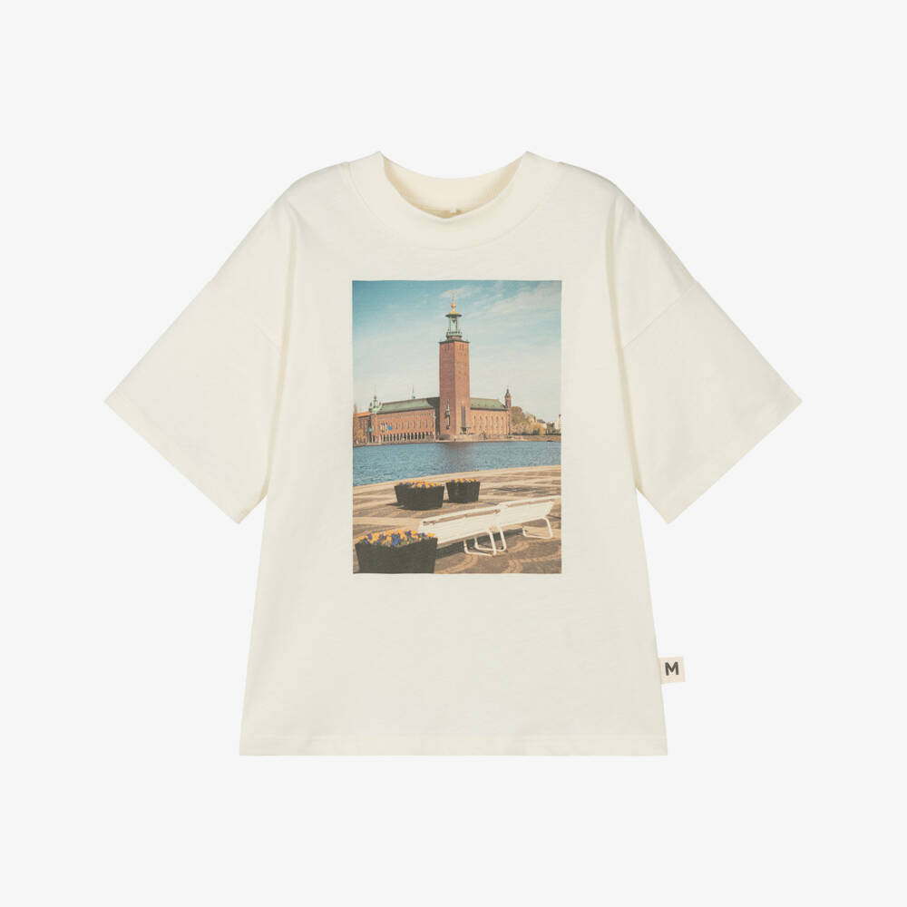 An ivory T-shirt for boys and girls from Mini Rodini, made in soft organic cotton. Cool and casual, this lovely wardrobe staple is finished with a large graphic print of Stockholm City Hall.