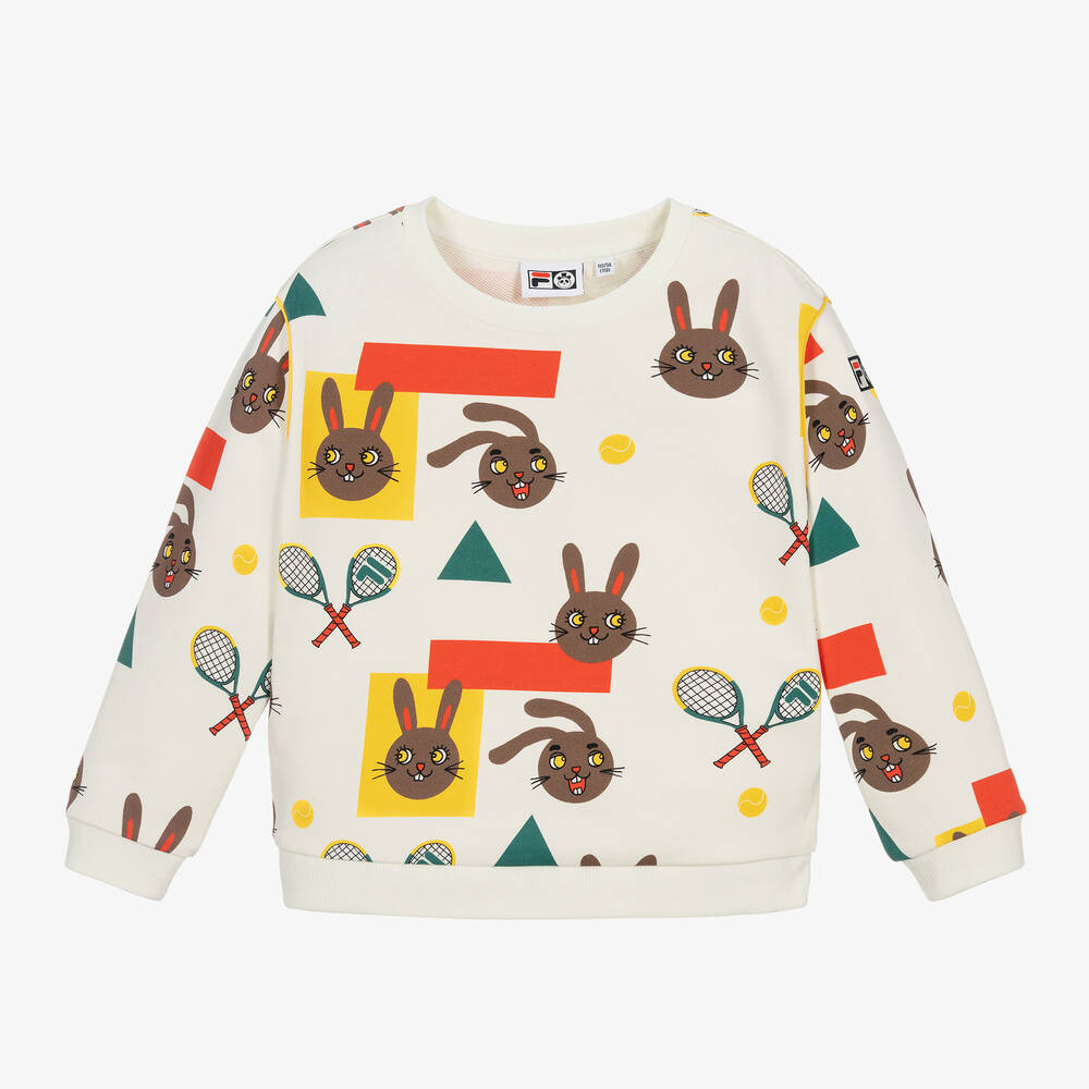 Ivory sweatshirt for boys and girls by Mini Rodini, made in mid-weight organic cotton jersey. Part of the FILA capsule, this long-sleeved top is printed with brown rabbits, yellow tennis balls and logo-branded rackets. It has cosy ribbed trims on the cuffs, neck, and hem and is ideal for layering over a T-shirt. A panda logo patch on one sleeve marks the iconic collaboration with the athleisure brand.