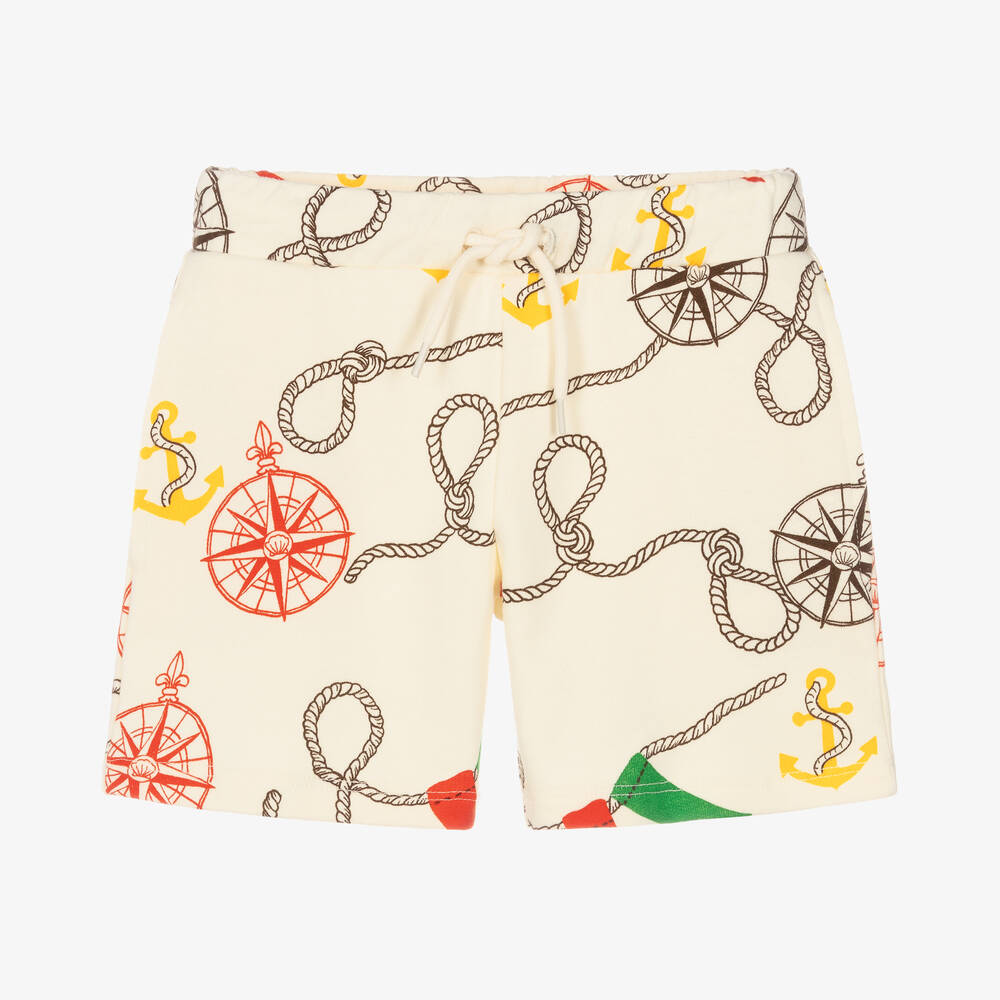 Ivory organic cotton shorts for boys and girls by Swedish brand Mini Rodini, with a fun nautical print highlighted in yellow, red and green. Just right for casual days, they are made in soft, comfortable jersey with useful, concealed side pockets and a drawstring on the elasticated waistband for a great fit.