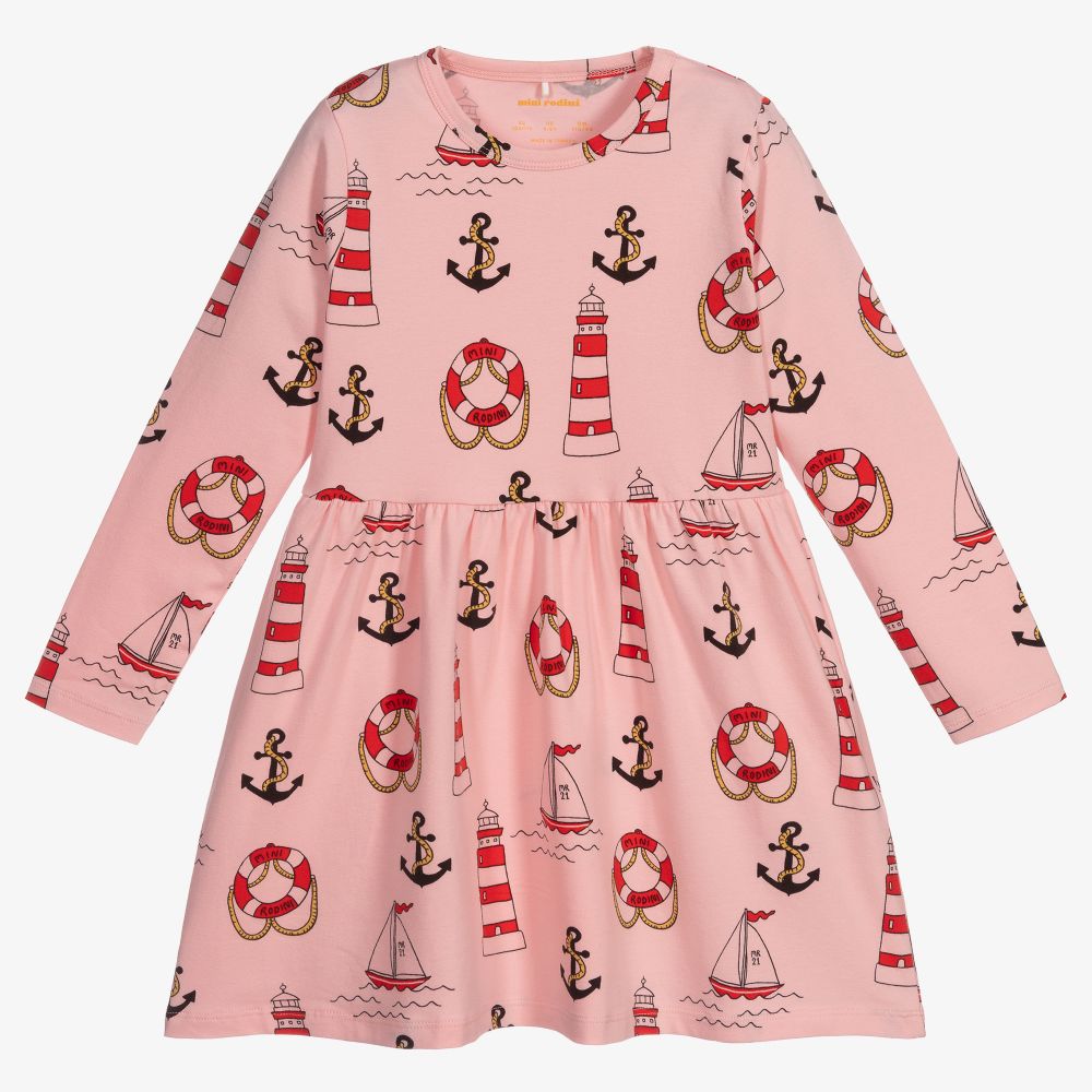 Girls pink organic cotton jersey dress by Mini Rodini, patterned with a nautical themed print in red, navy blue and yellow. Super soft and stretchy, it is gathered around the waist and slips on easily over the head.