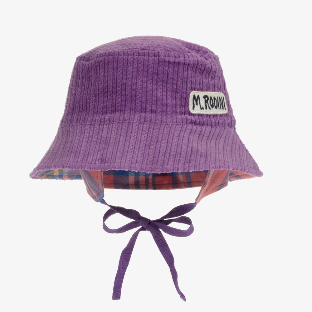 Purple bucket hat for girls by Mini Rodini, made in soft organic cotton corduroy. The pink and blue check lining is made in organic cotton twill with useful ear flaps and ties that fasten under the chin. It has a logo badge embroidered on the front.