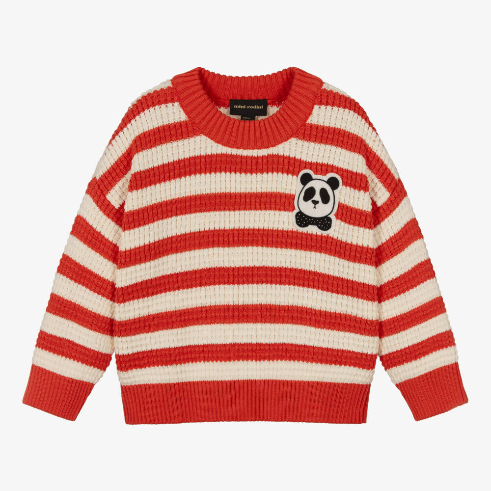 Red and ivory striped chunky knit sweater for boys and girls by Mini Rodini. Knitted from mid-weight organic cotton, it has ribbed trims and a cute panda appliqué on the front.