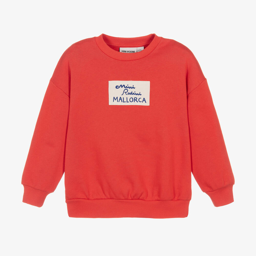 A flame red sweatshirt for boys and girls by Swedish label Mini Rodini, in mid-weight organic cotton. Styled in a relaxed fit with dropped shoulders, this cool style features branding and Spanish island 'Mallorca' signed on the ivory and blue canvas patch.