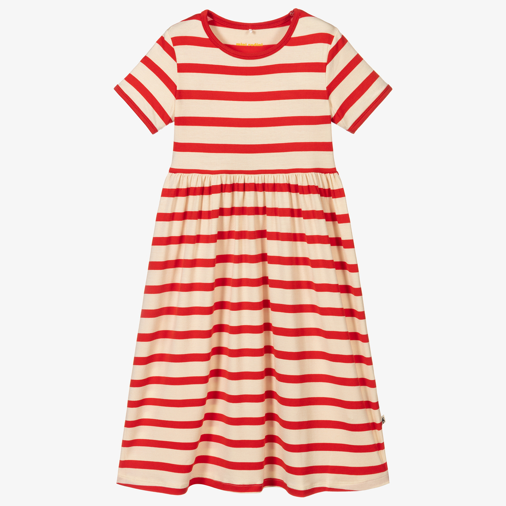 Made from sustainable lyocell, this red and light beige striped dress for girls by Mini Rodini. Super soft and stretchy, it has an elasticated gathered waist and a small logo tab on the side seam.