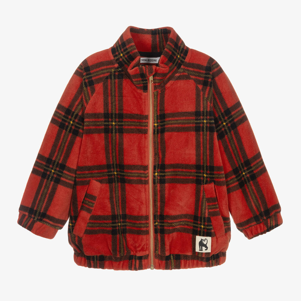 From Swedish designer, Mini Rodini, a red tartan zip-up top for boys and girls. This beautifully soft fleece top is ideal for layering on cooler days, with the high neck and gold zip fastening to keep the warmth in. There are two hand pockets and a black panther mascot patch stitched on the front. This product contains recycled materials made from post consumer waste.
