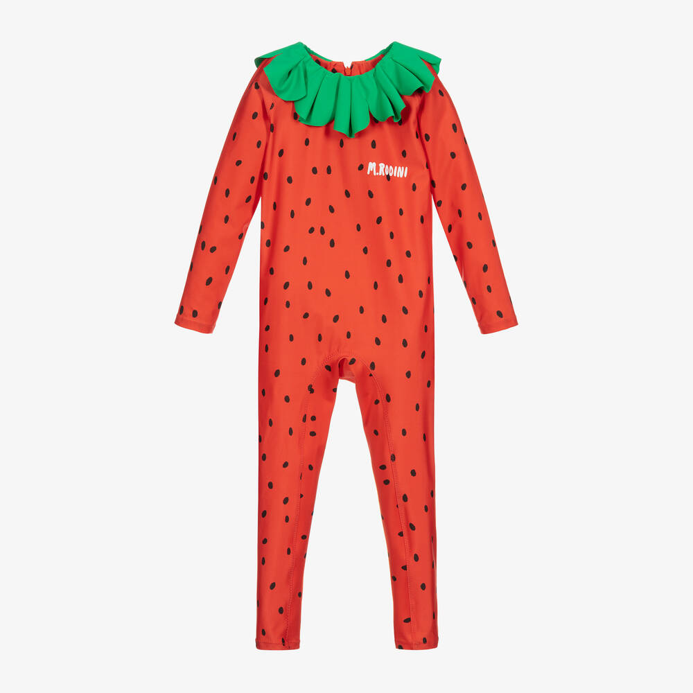 Red strawberry sun protective onesie for boys and girls by Mini Rodini, with UPF50+ sun protection. It is made in silky recycled polyester and fastens with a zip on the back. The designer's name is printed in white on the front, and it has green leaves around the neckline.