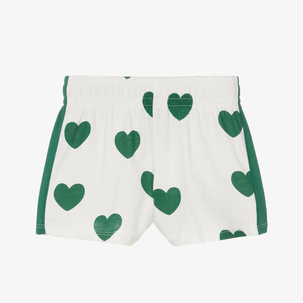 White organic cotton shorts for boys and girls by Mini Rodini, made from soft and stretchy jersey. This everyday, casual style is patterned in dark green hearts, with matching side trim for a sporty look. For comfort, the waistband is gently elasticated and has an internal, adjustable drawstring fastening.