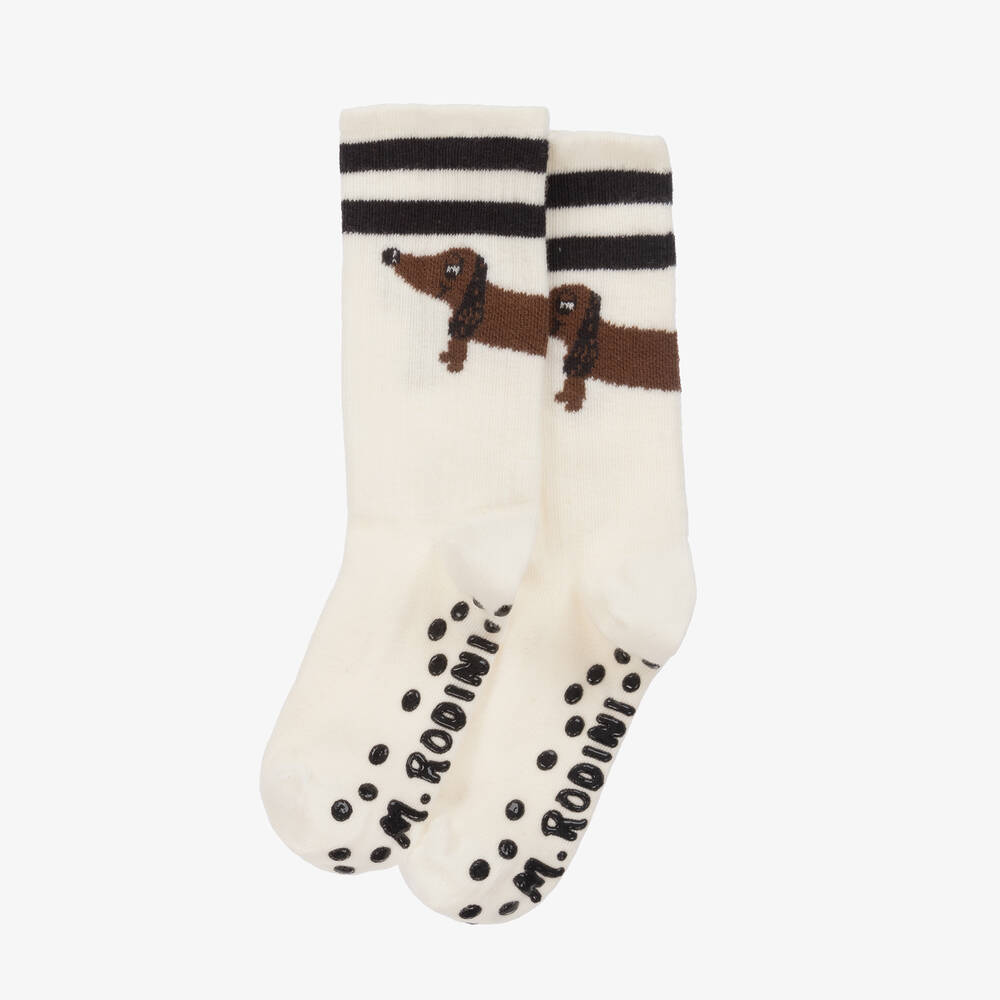 Off-white socks for boys and girls by Mini Rodini, made in a soft and stretchy organic cotton blend. They have a cute brown dog motif around each leg with sporty black stripes above. Rubbery black anti-slip dots and the designer's name are printed underfoot.
