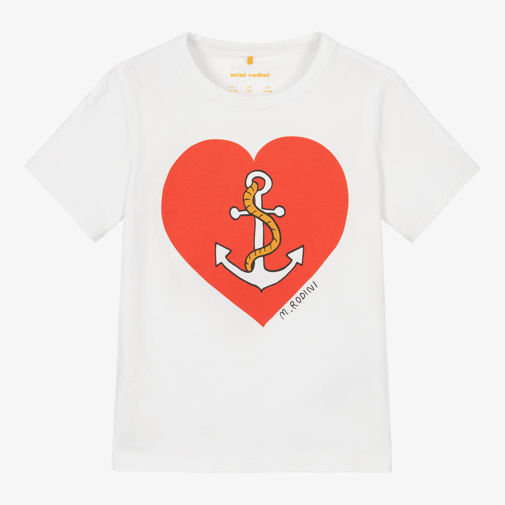 A nautical-inspired white T-shirt for boys and girls by Swedish brand Mini Rodini, made in soft and stretchy organic cotton jersey. It has a deep orange heart print on the front, with a white anchor and entwined rope motif in the centre. The designer's initials can be seen on the front for a subtle branded finish.