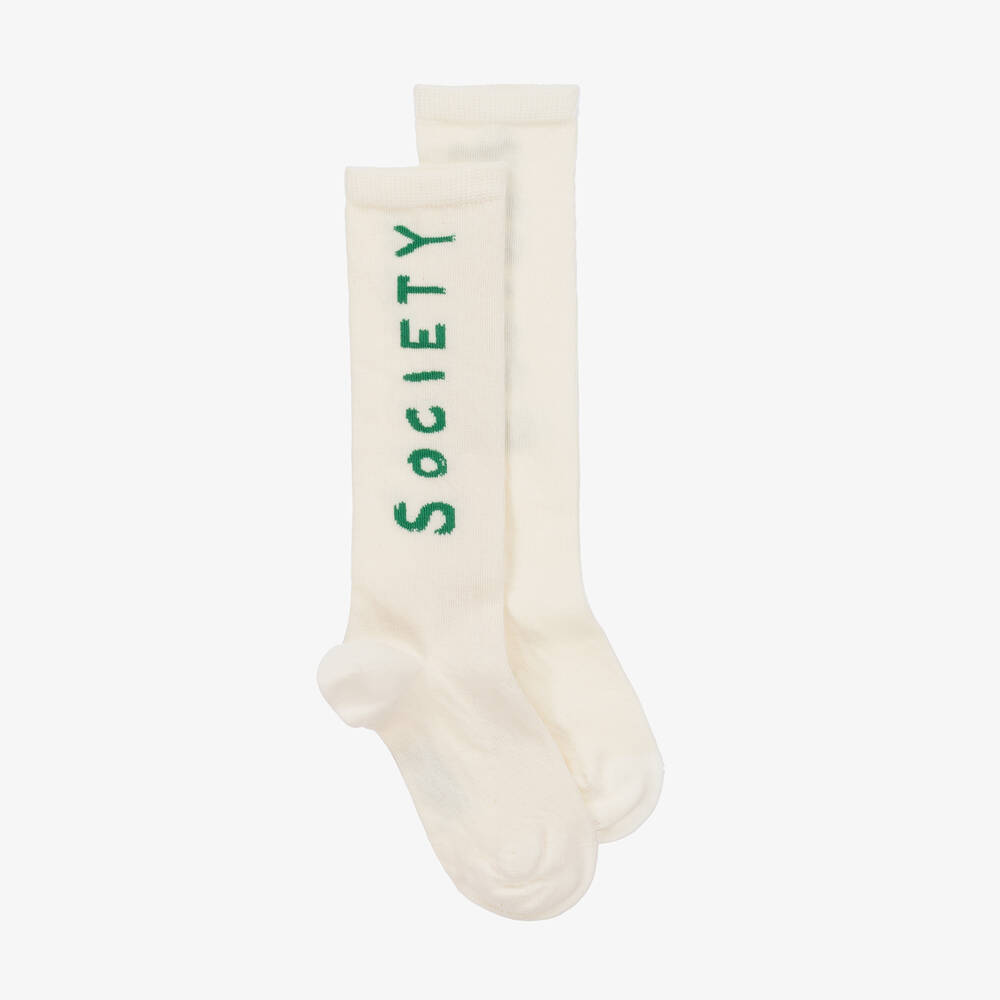Off-white knee-high socks for boys and girls by Mini Rodini. Made in a soft and stretchy organic cotton blend, these comfortable socks have a vertical, green 'Society' design on one side, with a logo underneath for designer appeal.