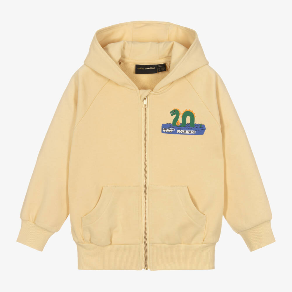 Boys and girls pale yellow hooded zip-up top by Mini Rodini, made in mid-weight organic cotton jersey. In the brand's typical style, it features a quirky print on the front depicting the green Loch Ness monster. There are comfortable ribbed trims and useful front pockets, ideal for little hands.