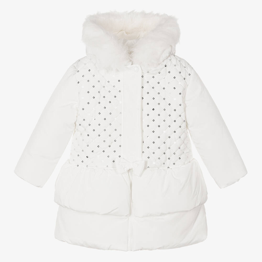 Glamorous white hooded coat for younger girls from Mintini Baby, with sparkly sequins on the front. Silky smooth and lightly padded, it has eye-catching faux fur trim on the hood and a gathered tiered skirt for a feminine shape. The coat fastens with a zip beneath a popper flap, and appliqué bows on the front and back add a cute finishing touch.