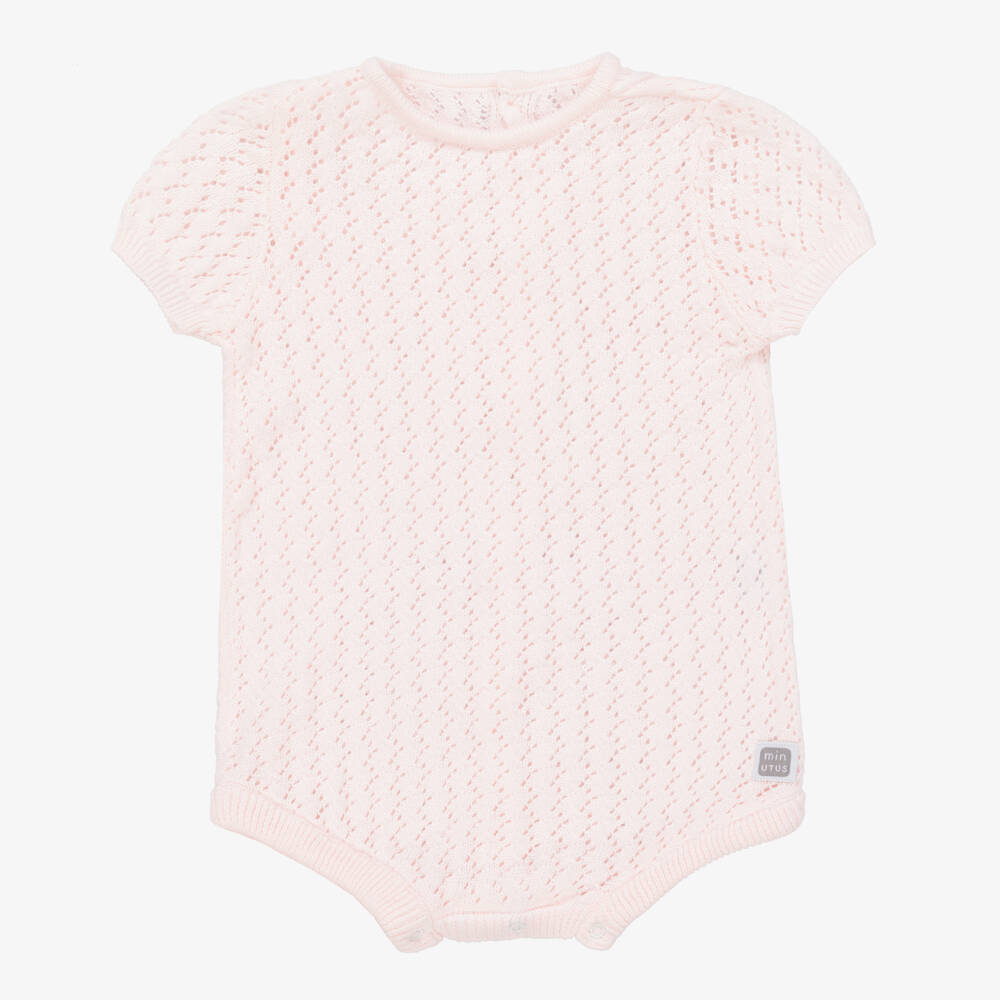 A lovely pale pink shortie for baby girls from Spanish brand Minutus. Lightweight and comfortable, it is made in a soft cotton pointelle knit, with ribbed trims. There are button fastenings on the back and poppers between the legs.