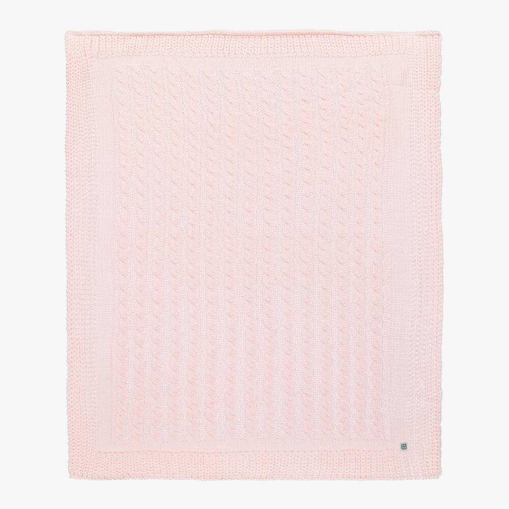 A wonderful pale pink blanket for baby girls by Spanish designer Minutus, knitted in a soft and thick cable-knit pattern. An attractive nursery accessory, it's also ideal for use in the car or buggy.
