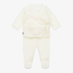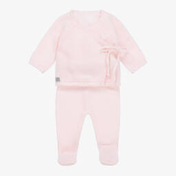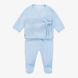 Adorable pale blue two-piece babygrow for boys by Spanish brand Minutus, in a beautifully soft and cosy knit. This simple trouser set features a wrap-over top with scalloped edges and knitted ties, and comfortable trousers with a gently elasticated waistband and enclosed feet. The designer's embroidered logo badge finishes both pieces.