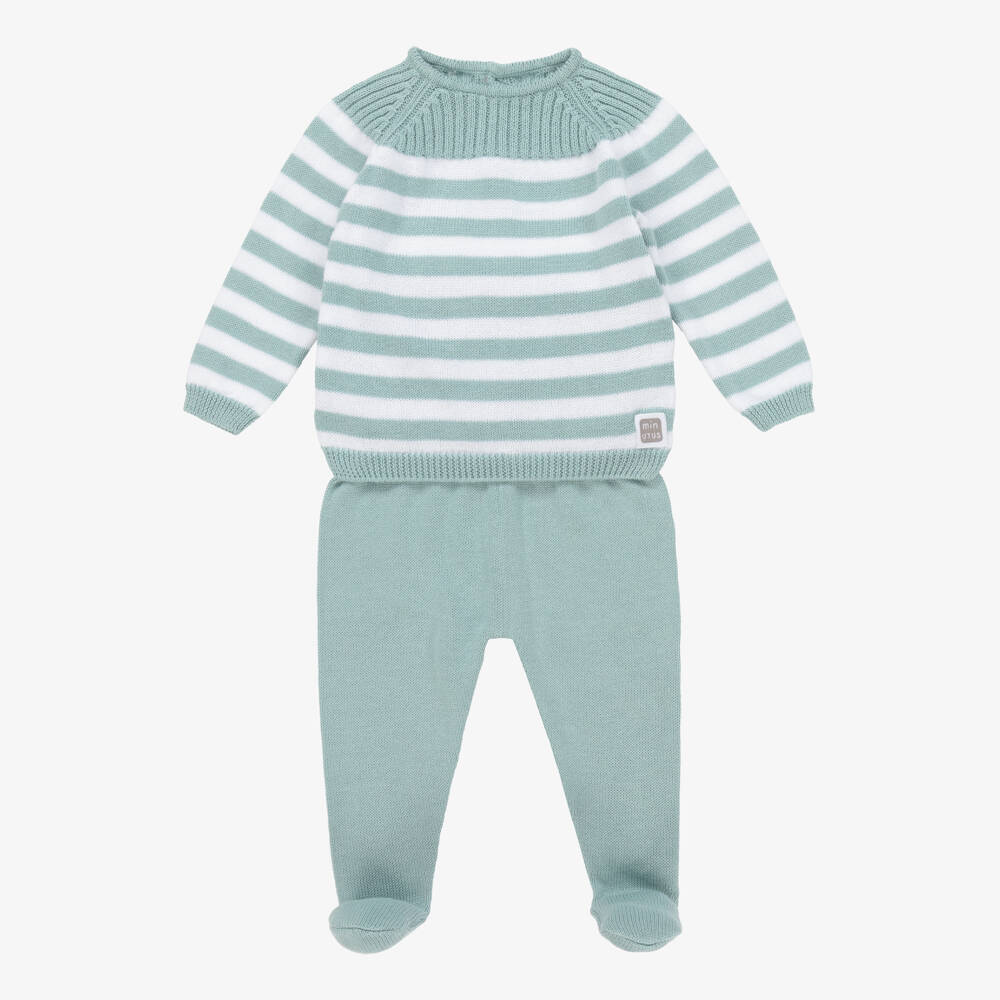 A lovely mint green two piece babygrow for boys and girls by Spanish brand Minutus, knitted from soft cotton. The striped top has a chunky knit detail around the neckline, with button fastenings on the back. The trousers have a comfortable fold-over, ribbed waistband. Both pieces feature a sweet logo patch for designer appeal.