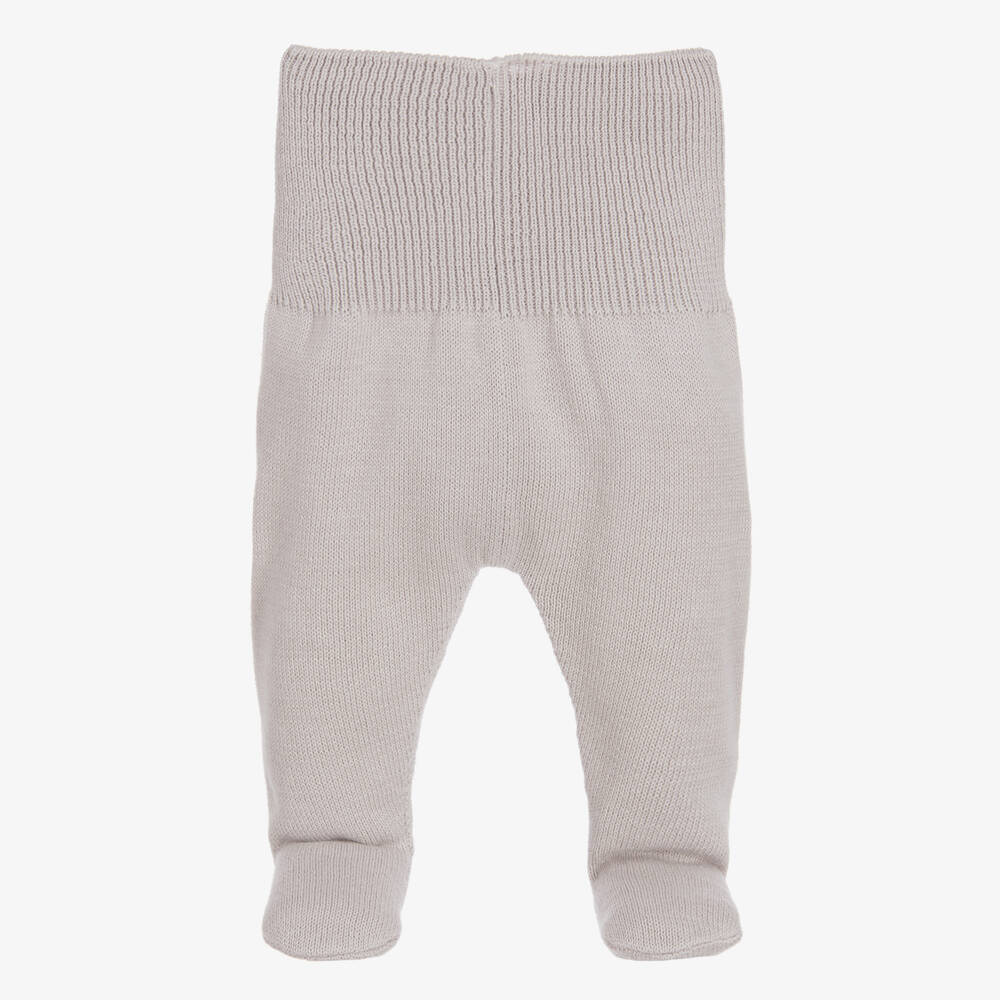 Cute, grey-beige baby trousers for boys and girls, by Spanish designer Minutus, made in a soft cotton knit. These comfortable trousers have a fold-over ribbed waistband and enclosed feet for an extra cosy feel.