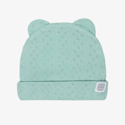 Adorable grey hat for baby boys and girls by Spanish designer, Minutus. Made in soft, stretchy knitted cotton, it has a logo patch on the back of the turned-up brim and is lovely for keeping little heads warm.