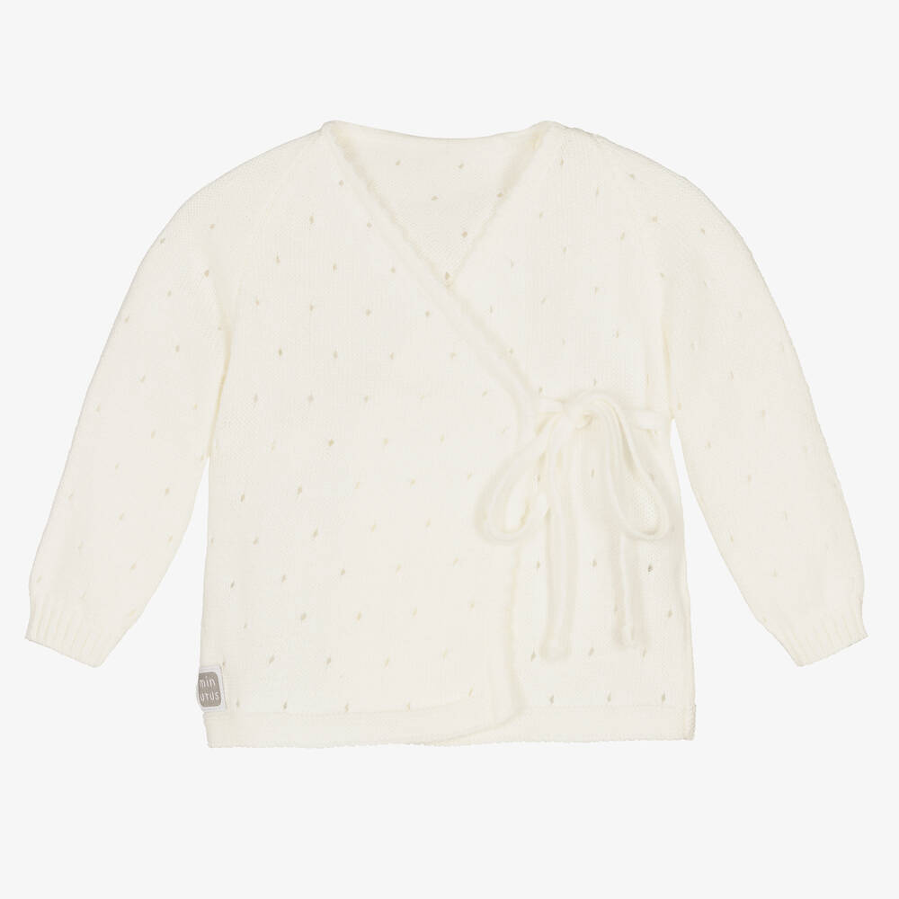 Adorable cotton cardigan for baby boys and girls by Minutus. In a soft and fine cotton pointelle knit, it has a cross-over front which ties at the side.