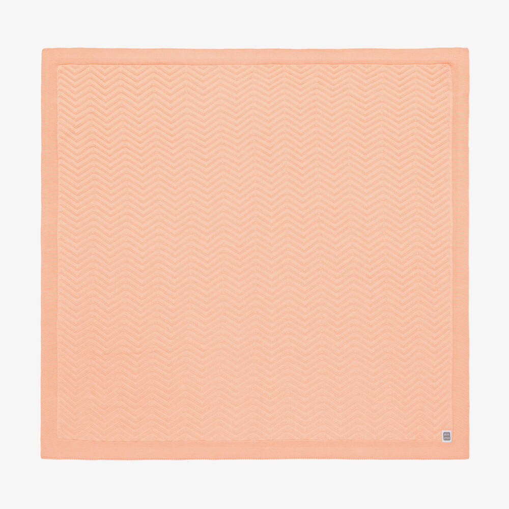 Sweet pale orange blanket for baby boys and girls by Spanish designer Minutus. Made in soft, finely knitted cotton, it has a raised chevron pattern and a sweet logo patch in one corner. An attractive nursery accessory, its lightweight design means it can also be used in the car seat or stroller.