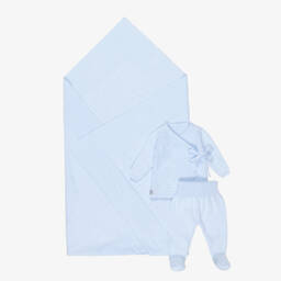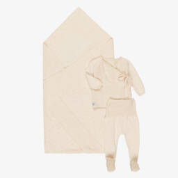 This light pink babygrow and blanket set for girls by Minutus is knitted in soft cotton with a charming tonal bear design. The two-piece babygrow has a wrap-over style top with tie fastenings on the sides and matching trousers with a wide, ribbed waistband for a comfortable fit. The coordinating blanket, which completes the set, is ideal for keeping little ones warm and cosy.