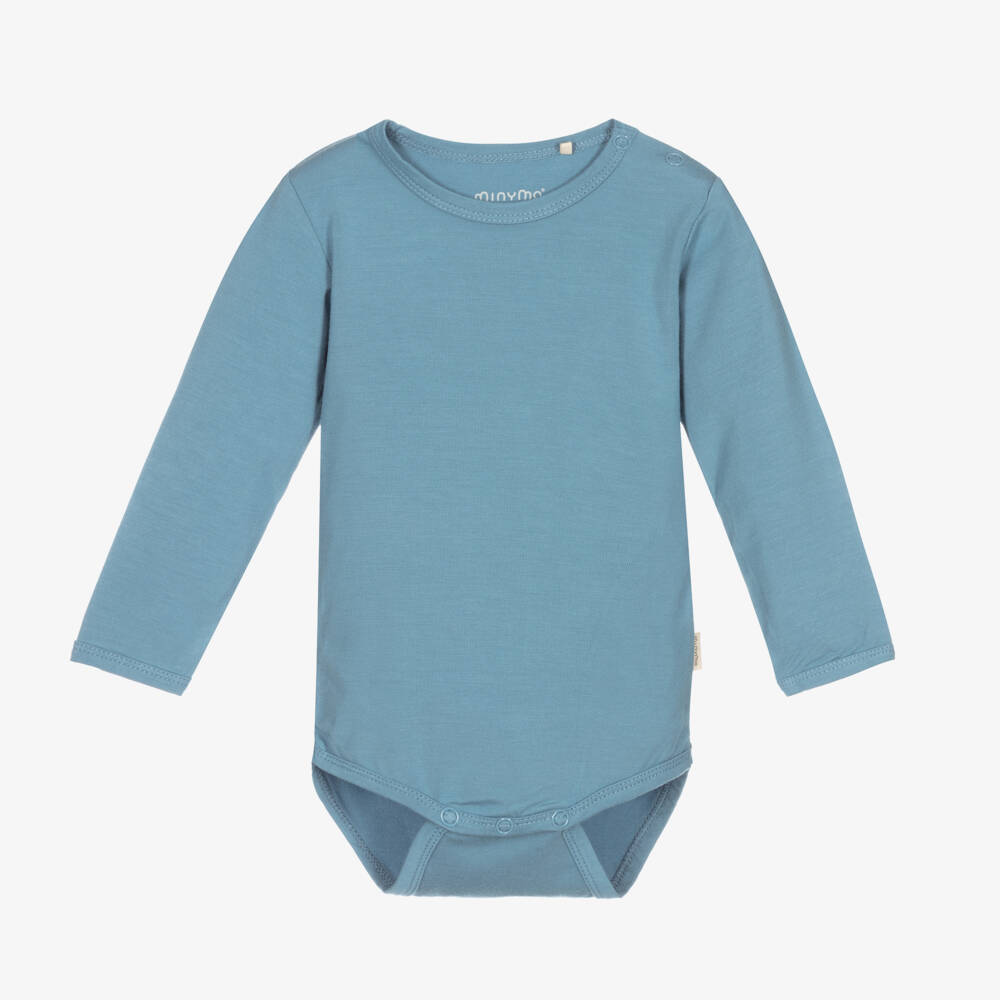 Blue bodyvest for baby boys and girls by Danish brand Minymo. Super soft and comfortable, it is made in environmentally-friendly bamboo viscose which regulates temperature naturally. Lightweight and stretchy, it fastens with poppers on the shoulder and between the legs.