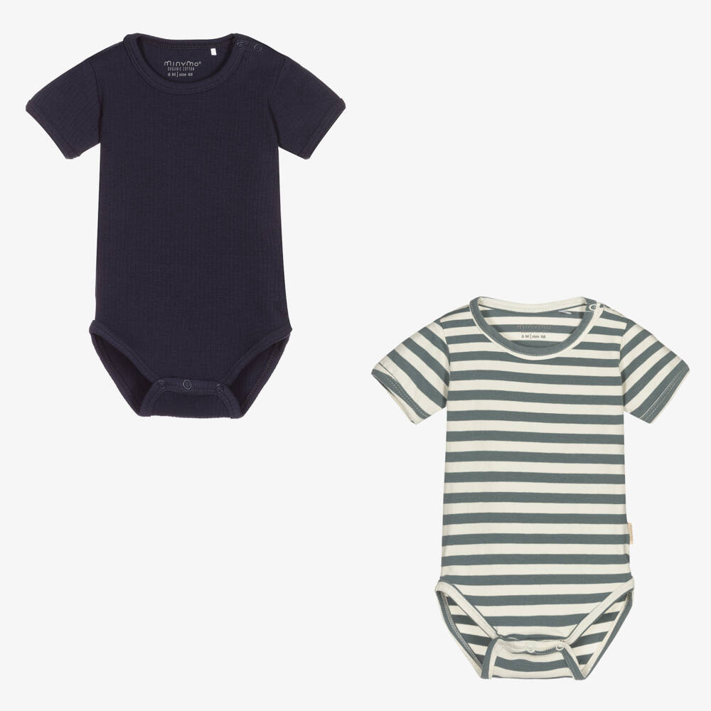Pack of two bodyvests for baby boys and girls by Danish brand Minymo, made in soft organic cotton jersey. In shades of blue and ivory, one has a striped pattern whilst the other is in a plain ribbed fabric. Both have popper fastenings on the shoulder and between the legs.
