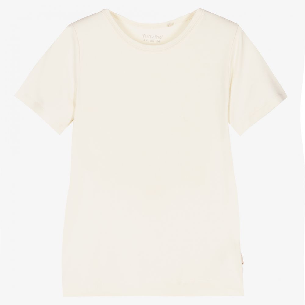 Ivory T-shirt for boys by Danish designer Minymo, with a logo tab on one side seam. It is made in super soft bamboo viscose jersey, which naturally regulates body temperature and is anti-bacterial.