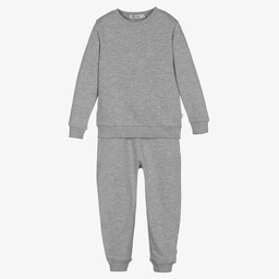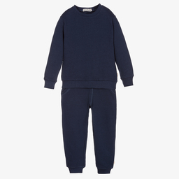 Navy blue tracksuit for both girls and boys by Danish designer Minymo. It is made in soft cotton jersey with a super soft fleecy inside and ribbed trims. Both the sweatshirt and joggers have the brand's logo tab on one side seam. The joggers have a useful ivory drawstring on the waistband and jetted front pockets.