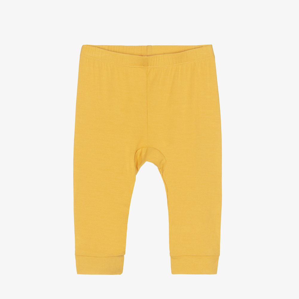 Mustard yellow leggings for baby boys and girls by Danish brand Minymo. Super soft and comfortable, they are made in environmentally-friendly bamboo viscose which regulates temperature naturally. Lightweight and stretchy, they have a gently elasticated waistband.