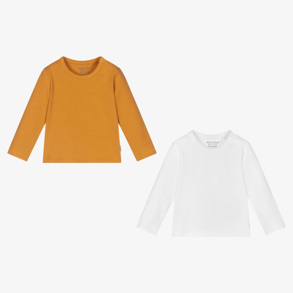 Pack of two organic cotton jersey tops by Minymo for baby girls and boys. Soft and stretchy, one is plain white and the other is mustard yellow. Both have poppers on one shoulder for easy dressing.