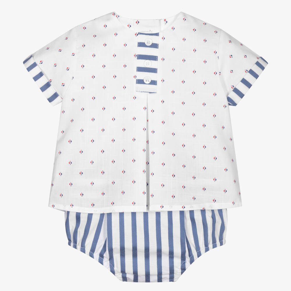 A sweet white and blue shorts set for baby boys by Miranda, made in soft and lightweight cotton poplin. The shorts have a striped pattern and decorative red button tabs on the front. They have an elasticated waistband and leg cuffs. The white top has a delicate circular pattern and is trimmed in striped poplin. It fastens with buttons on the back.