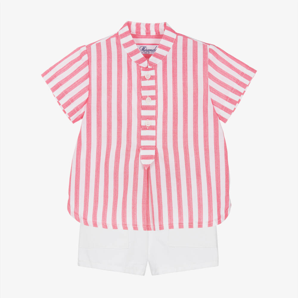 Summery red and white cotton shorts set for baby boys by Miranda. The lightweight striped shirt is cool for warmer days, with its mandarin collar and short sleeves. The twill shorts have a semi-elasticated waist and cuffs for a comfortable fit. Easy to wear, they simply pull up.