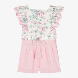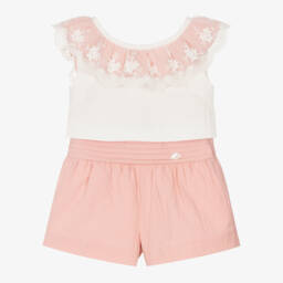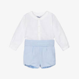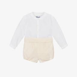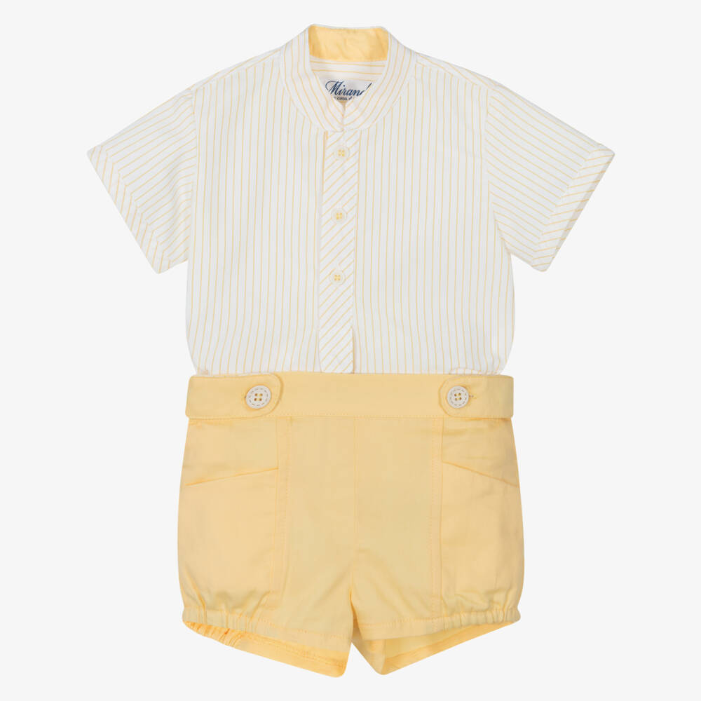 White and yellow shorts set for baby boys by Miranda, woven in soft, lightweight cotton. In a smart collarless style, the striped shirt fastens with buttons on the front. Completing the look, the shorts have little pockets, gently elasticated trims and neat button fastenings on both sides.