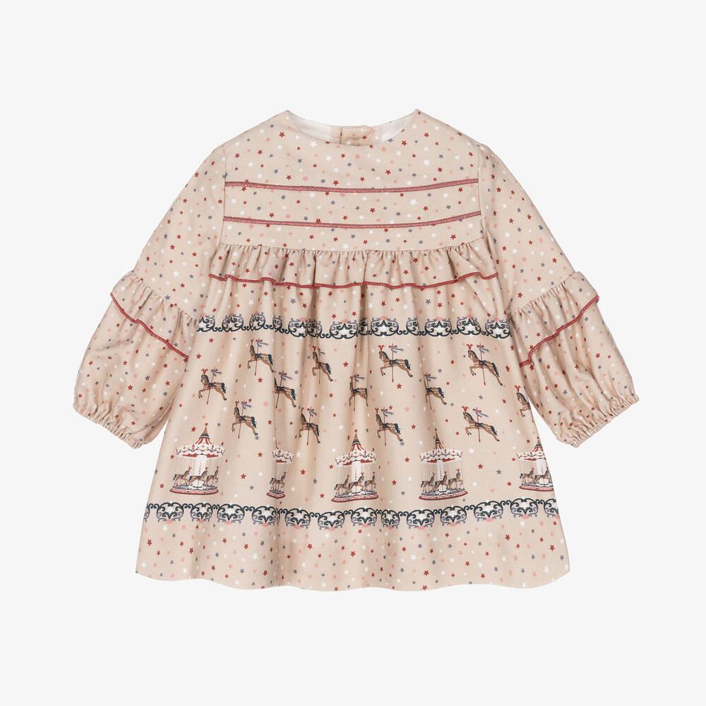 Sweet beige dress for baby girls by Miranda, softly woven in cotton twill. Printed with playful stars and a whimsical carousel pattern, this cute dress has tiered ruffles on the bodice and long sleeves. Glittery red stripes add a touch of sparkle to the look. Lined for comfort against little one's skin, it fastens with classic buttons on the back.