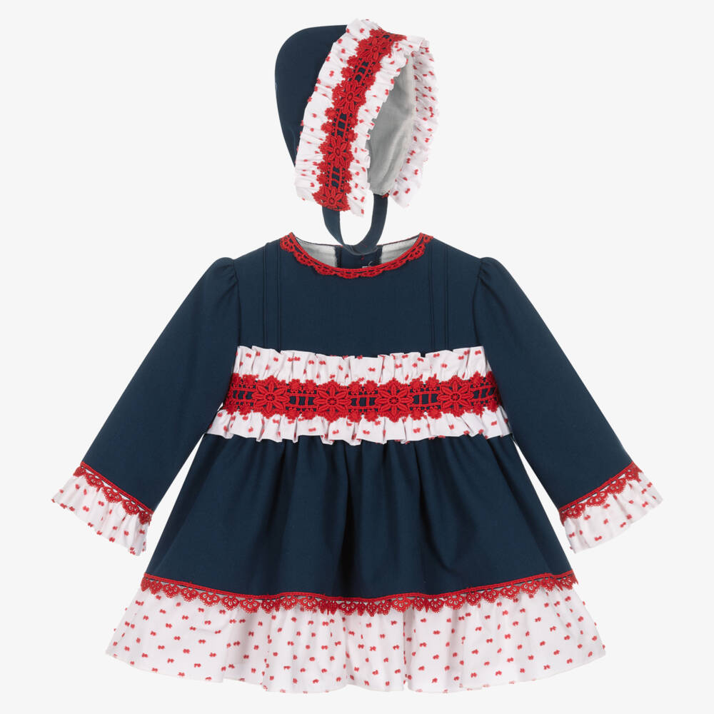 Traditionally styled, this navy blue dress set for baby girls is from Spanish brand Miranda. The dress and bonnet have white ruffled trims, with red plumetis and lace detailing, whilst there are red lace-trimmed ruffles on the bloomers. The dress has smart pintucks on the bodice, with a large, white, eye-catching bow and red button fastenings with a popper on the back. The bonnet fastens with a red button under the chin and is gently elasticated at the back for a great fit. All three pieces of the set are lined for comfort.