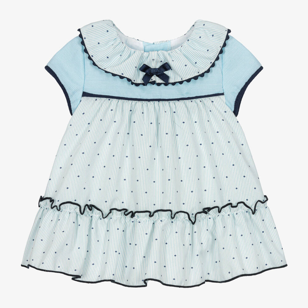 Baby girls blue dress, by Miranda. Woven in soft lightweight cotton, the ruffle-trimmed dress has delicate stripes and a navy blue diamond all-over print. Fastening with buttons on the back, it has a traditional ruffle trim collar with a sweet bow and scalloped edging. It comes with matching elasticated knickers to complete the cute, co-ordinated set.