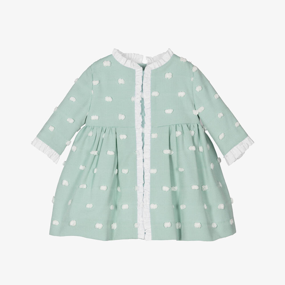 Cute mint green dress for baby girls by Miranda, dotted with fluffy white pom-poms. Trimmed with white cotton ruffles, it fastens with pearlised buttons on the back. This sweet style has a voluminous skirt with a smart, pleated effect and is fully lined for comfort.