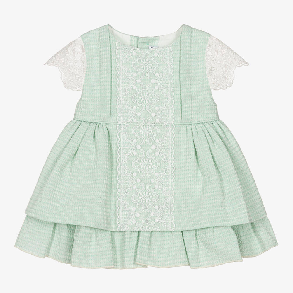A lovely mint green dress for baby girls by Spanish brand, Miranda. Woven in soft jacquard, it has lace detailing on the bodice and shoulders and a tiered hem. There is a sash belt that ties in a bow on the back and button fastenings. It is fully lined in a soft cotton blend fabric.