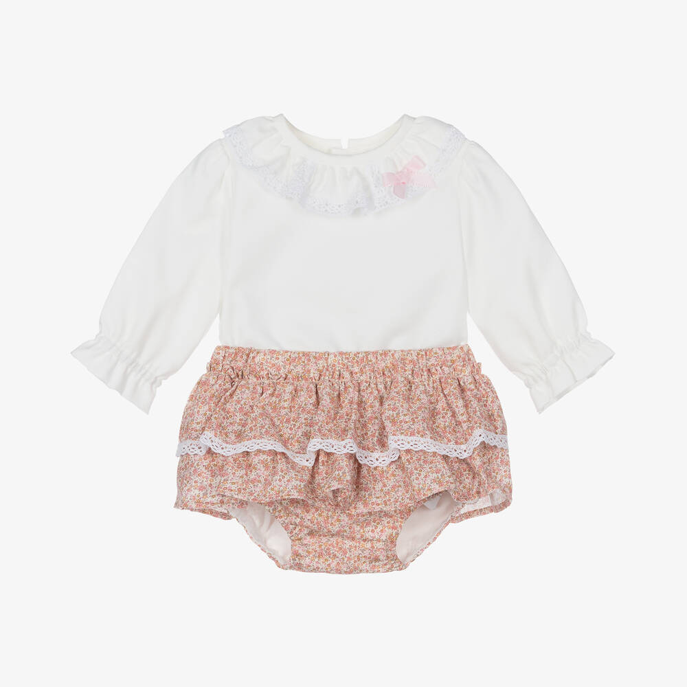 Cute ivory and pink shorts set for baby girls by Spanish brand Miranda. Made in a soft cotton blend, the blouse has a pretty ruffle collar with lace trim and a pink bow. It fastens neatly on the back with buttons. The pink cotton shorts have a pretty ditsy floral print and are fully lined for comfort. They have sweet ruffles trimmed with ivory lace and an elasticated waistband.